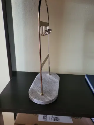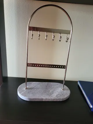 Scaffale elegante per organizzare le tue gioie. Base ovale in marmo con venature grigie. Struttura metallica argentata. Molteplici ganci per collane e bracciali. Fori per orecchini.