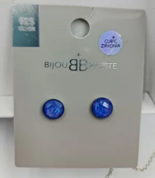 Set di gioielli del marchio Bijou Brigitte che include un paio di orecchini e due collane. - Orecchini rotondi in argento color blu con zirconia. - Orecchini a lobo a forma di stella e luna in argento. - Collane con ciondolo Yin Yang diviso, con l'iscrizione BEST FRIENDS e dettagli brillanti. Prezzo di mercato 50€