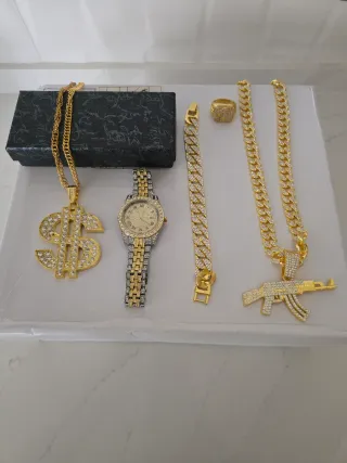 Set di gioielli in imitazione con finitura in oro. Include vari accessori: - Collana con ciondolo a forma di dollaro. - Orologio da polso. - Bracciale. - Anello. - Collana con ciondolo AK-47. Vendo confezione di gioielli in oro imitazione, utilizzabile come preferisci, sia per indossarli sia per travestimenti. L'orologio funziona perfettamente. È stato usato solo per una sessione fotografica.