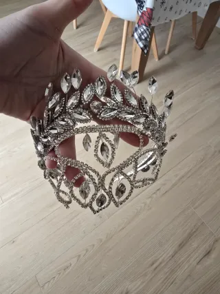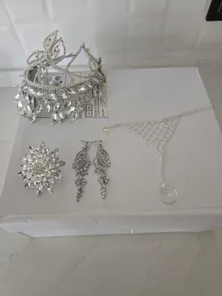Set di bijoux per donna. - Corona di strass. - Orecchini lunghi pendenti. - Anello a fiore. - Bracciale con catena e anello. Borsa brillante e alcune ciglia finte. Vendo il pacchetto di gioielli nuovo, usato solo per una sessione fotografica.