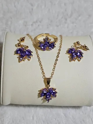 Elegante set di orologio e gioielli con dettagli in viola e oro. - Bracciale di orologio decorato con pietre. - Collana con ciondolo abbinato. - Orecchini. - Anello.