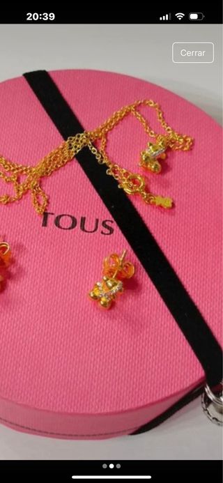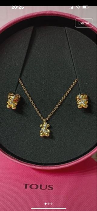 Splendido set di gioielli del marchio Tous. - Design di orsetto. - Finitura in tono dorato. - Include collana e orecchini.
