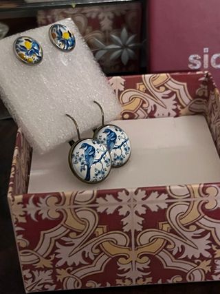 Deliziosa parure composta da due paia di orecchini con un motivo di uccelli blu su un ramo fiorito e l’altro con limoni . Con scatola - Un paio di orecchini a lobo. - Un paio di orecchini pendenti.