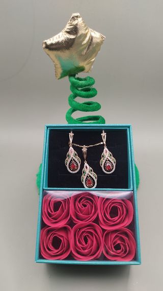 Splendida parure confezione regalo Catenina e orecchini con ciondolo gioiello Bijoux di ottima fattura Il ciondolo misura 3 cm ed è tempestato di pietre luminose Centrale a goccia rosso fuoco Con scatolina regalo particolarissima, contiene anche 6 rose finte Per un dono speciale