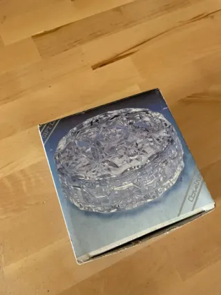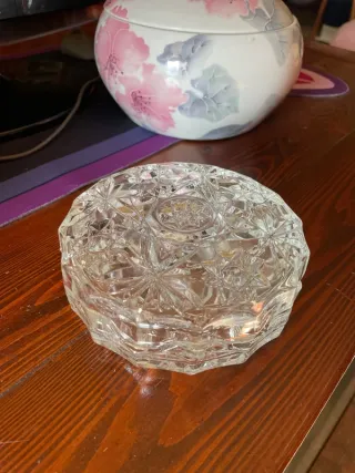 Elegante porta gioie vintage realizzato in cristallo finemente lavorato. Un pezzo unico che aggiunge un tocco di classe a qualsiasi ambiente. - Materiale: Cristallo trasparente. - Design: Motivi geometrici e floreali intagliati. - Forma: Ottagonale.