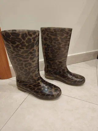 Vendo stivali Wellington da pioggia maculati leopardati animalier in gomma alti al polpaccio, firmati Stuart Weitzman, come nuovi, indossati una volta sola, taglia M perfetta per un numero 38, misure in foto, scatola originale inclusa, vedere in foto condizioni della scatola.