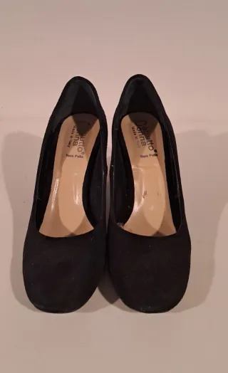 Eleganti scarpe con tacco alto Angelia&Jones tg. 37. - Materiale scamosciato nero. - Dettagli rossi a contrasto. - Plateau.