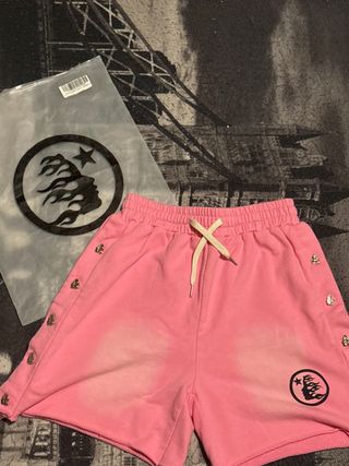 Pantaloncini comodi e alla moda. - Colore rosa vivace. - Dettagli con bottoni sui lati. - Coulisse in vita per una vestibilità personalizzata. - Logo circolare con profilo di volto e stella.