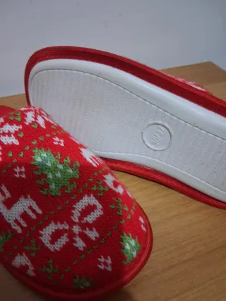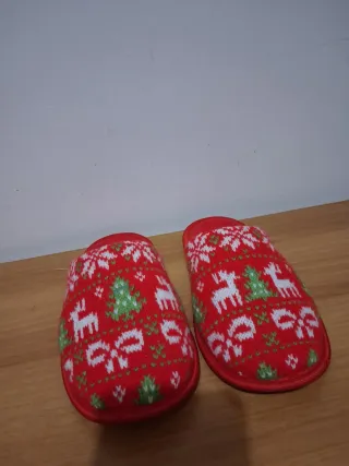 Pantofole invernali con un allegro tema natalizio. - Design con renne e alberi di Natale. - Colore rosso vivace.