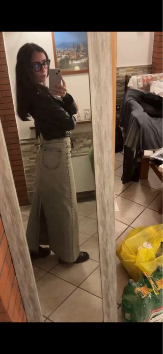 Gonna in denim lunga con un design a pannelli e orlo sfrangiato. - Modello a vita alta. - Chiusura con zip e bottone. - Tasche anteriori e posteriori. 100% cotone