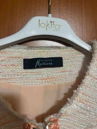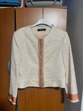 Elegante giacca corta con dettagli raffinati. - Tessuto bouclé con fili rosa e beige. - Bordatura frontale con catenella. - Fondo manica con nastro in raso e frange. - Scollo rotondo senza colletto. difetti di cucitura (4 e 7 foto)