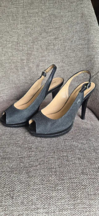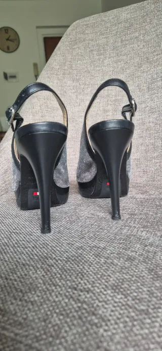 Eleganti décolleté con tacco alto e cinturino posteriore. - Punta aperta. - Dettagli in pelle. - Tessuto effetto denim.