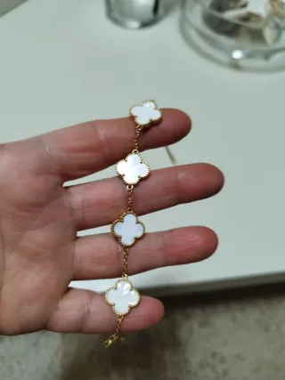 Elegante braccialetto con cinque pendenti a forma di quadrifoglio. - Materiale: acciaio inossidabile. - Design: quadrifogli bianchi con dettagli dorati.