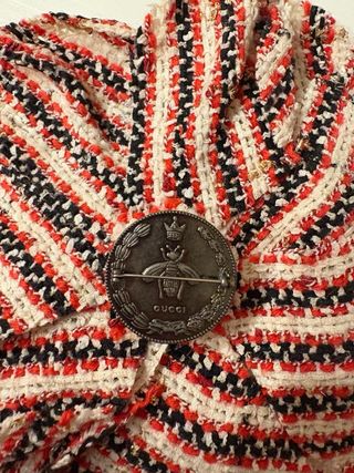 La cravatta è una Gucci vintage con motivo a morsetto equestre, un tema iconico del marchio. Il pattern dorato su fondo marrone e la fodera interna color oro sono caratteristiche che richiamano le collezioni degli anni ’70-’ Il tessuto — le cravatte vintage Gucci erano in pura seta con una mano più spessa rispetto a oggi Dimensioni ancora big un 10 cm larghezza Usata e con un buchino all interno della fodera non visibile ma c e. esterno buono stato