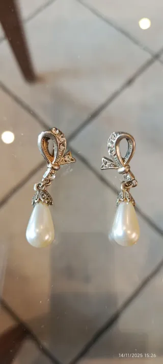 Eleganti orecchini pendenti con un design a fiocco impreziosito da strass e una goccia di perla. - Design a fiocco con dettagli strass. - Pendente a goccia in perla. - Montatura color argento.