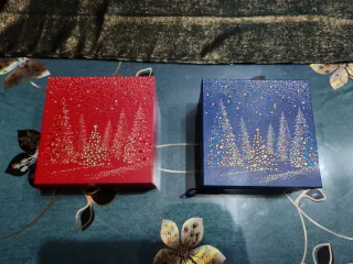 Set di due portagioie a tema natalizio, uno rosso e uno blu, con decorazioni scintillanti, di cartone. Nasce come scatola di cioccolatini, ma il design la rende ideale per un nuovo utilizzo. - Design con alberi di Natale. - Dettagli in rilievo dorati e argentati. - Ideali per un regalo o per decorare la casa durante le feste.