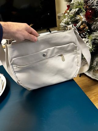 Borsa a tracolla Samsonite in un elegante colore grigio chiaro. Perfetta per l'uso quotidiano. - Materiale resistente. - Design pratico con tasche esterne. - Tracolla regolabile per un comfort ottimale.