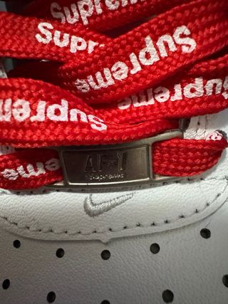 Scarpe Nike Air Force 1 in collaborazione con Supreme. Un modello iconico rivisitato con dettagli unici. - Lacci rossi con logo Supreme. - Logo Supreme sul pannello laterale posteriore.