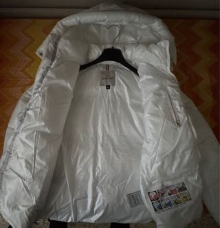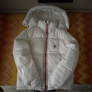 Giacca imbottita Moncler Maya in un brillante bianco. - Cappuccio integrato. - Chiusura frontale con zip. - Tasca sul petto con patta. - Dettagli a contrasto sulla zip.