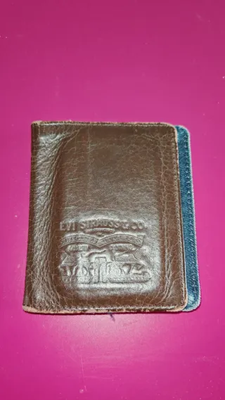 Portafoglio carte Levi's in pelle marrone e dettagli in jeans. - Design compatto e funzionale. - Logo Levi Strauss & Co. impresso sul fronte.