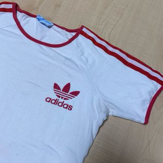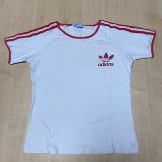 Splendida t-shirt originale Adidas Originals dal taglio femminile/slim fit. Un vero pezzo vintage caratterizzato dall'iconico logo a trifoglio (Trefoil) sul petto e le classiche tre strisce sulle maniche. • Colore: Bianco con dettagli rosso scuro/bordeaux. • Stile: Ringer tee con bordi del colletto e delle maniche a contrasto. • Dettagli: Logo serigrafato con effetto "vissuto" (distressed) tipico del vintage autentico. • Condizioni: Buone condizioni generali, tessuto morbido e confortevole. Nota importante: Per garantire la massima igiene e freschezza, tutti i capi verranno accuratamente lavati e igienizzati prima di essere spediti