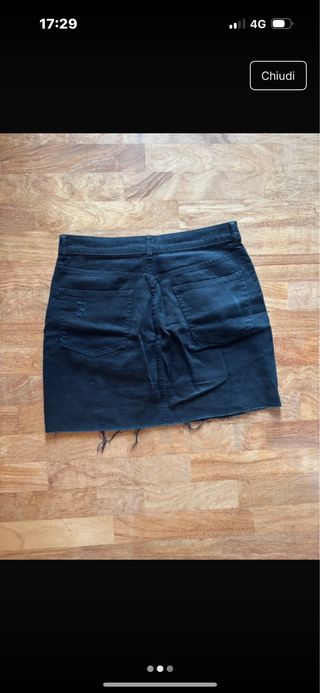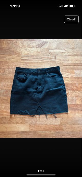 Gonna in denim nera del brand Calliope. Modello corto con dettagli sfrangiati. - Vita alta. - Chiusura con zip e bottone. - Tasche anteriori e posteriori.