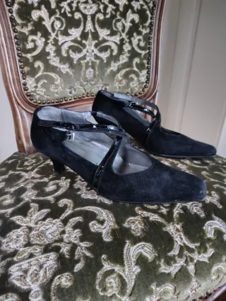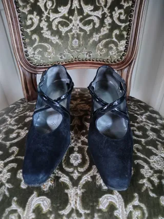 Eleganti scarpe da donna nere in pelle scamosciata. Materiale: Pelle scamosciata Dettagli incrociati lucidi. Altezza tacco: 4 cm. In perfetto stato. Sono disponibile a trattative. Applico sconti se si vuole creare un set dal mio guardaroba. Nei miei pacchetti, confezionati con cura, lascio sempre un regalino per i miei acquirenti ❣️