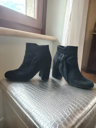 Deliziosi stivali stivaletti/tronchetti neri in similpelle effetto scamosciato, arricchiti da un nodo/fiocco realizzato all'altezza del malleolo, rivolto verso l'esterno. Il tacco strutturato è di 7 cm, sono molto comodi. Misura 39. Tenuti molto bene, sono in ottime condizioni. Sono disponibile a trattative. Applico sconti se si vuole creare un set dal mio guardaroba. Nei miei pacchetti, confezionati con cura, lascio sempre un regalino per i miei acquirenti ❣️