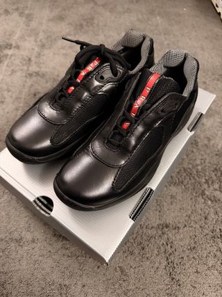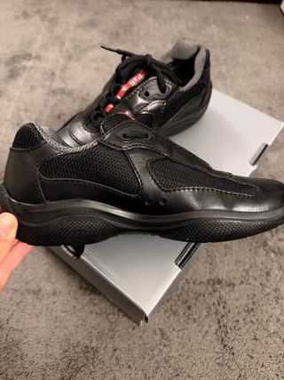 Sneakers Prada modello American Cup. - Tomaia in pelle e mesh. - Dettaglio iconico rosso sulla linguetta. - Suola in gomma.