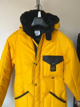 Parka Refrigiwear in colore giallo, taglia XS. Nuova, mai usata. - Cappuccio con pelliccia sintetica nera. - Tasca sul petto con patta in ecopelle nera. - Chiusura con zip e bottoni a pressione. - Dettagli in ecopelle nera sui bordi delle tasche inferiori. 👕 Marca: Refrigiwear 🩶 Condizioni: Nuovo, mai indossato 🏷️ Taglia: XS 🎩 Colore: giallo 💎 Stile: Classico Parka Refrigiwear, Modello Cruzcampo, Made in U.S.A. ⸻ 📏 MISURE A CAPO DISTESO 👔 Giacca: • Spalle: cm 46 • Torace (da ascella a ascella): cm 46 • Manica: cm 67 • Lunghezza totale: cm 84 (Le misure sono prese a capo disteso, margine d’errore ±1 cm)