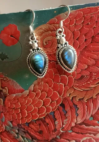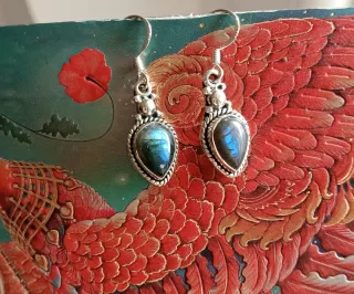 Eleganti orecchini pendenti realizzati in Argento 925 con pietra dura naturale di Labradorite blu. La pietra dona riflessi unici e cangianti.