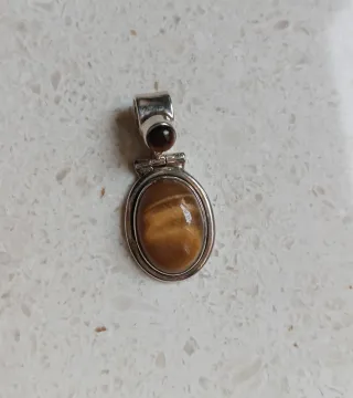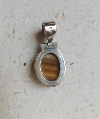 Elegante ciondolo in Argento 925 con pietre Occhio di Tigre. - Pietra principale a forma ovale. - Dettaglio di una piccola pietra rotonda. - Montatura in argento lucido.