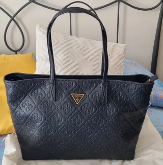 Elegante borsa Guess in ecopelle nera, con una bellissima trapuntatura a rombi che dona un tocco di stile. - Logo Guess dorato sul davanti. - Manici comodi per portarla a mano o a spalla. - Chiusura superiore con zip.