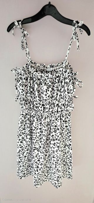 Vestito corto con stampa floreale all-over. Presenta un design arricciato sul corpetto e spalline sottili con fiocchi. - Spalline con fiocchi regolabili. - Elastico in vita per una vestibilità comoda. - Orlo leggermente svasato.