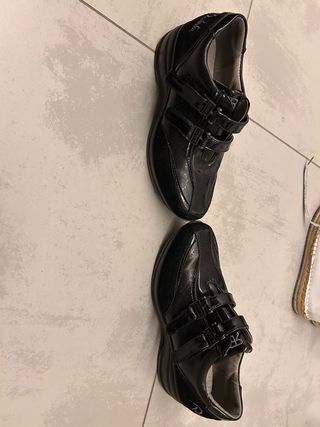 Eleganti scarpe da donna con un design moderno. - Dettagli in vernice lucida. - Chiusura con doppie fibbie. - Inserti in tessuto testurizzato.