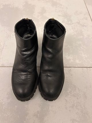 Stivaletti alla caviglia in pelle nera. - Zip posteriore per facilitare la calzata. - Suola carrarmato robusta. - Design moderno e versatile.