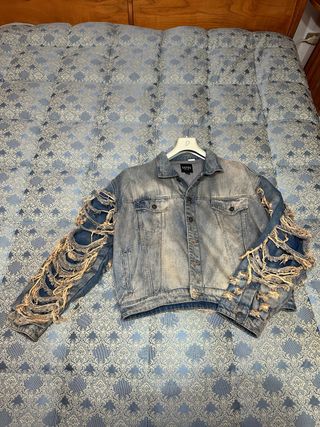 Giacca in denim dal design streetwear, perfetta per un look audace. - Maniche con dettagli strappati e frange. - Chiusura frontale con bottoni. - Tasche sul petto.