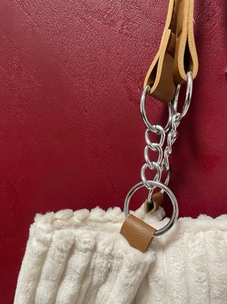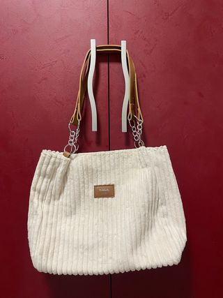 Borsa a spalla in morbido velluto a coste, colore bianco panna. La borsa presenta un design capiente e versatile, con manici in ecopelle e dettagli a catena. Mai utilizzata - Materiale: velluto a coste - Colore: bianco panna - Dettagli: manici in ecopelle, catena - Chiusura: non specificata