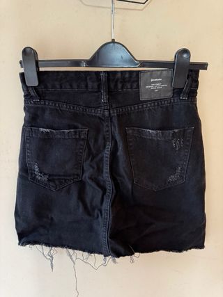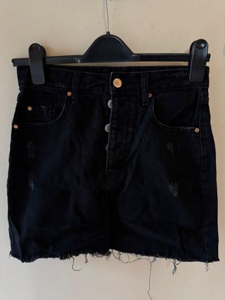 Gonna in denim nera con dettagli strappati e orlo sfrangiato. - Chiusura con bottoni. - Tasche anteriori e posteriori. - Design corto e aderente.