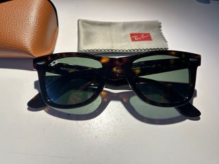 Occhiali da sole Ray-Ban Wayfarer unisex: Montatura tartarugata, Lenti verdi, Custodia in pelle marrone, Panno per la pulizia. Comprati a dicembre perche credevo di aver perso i miei e mo li ho trovati e non mi servono piu... li ho usati 1 volta dato che non c’é sole sto periodo :(