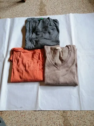 Set di tre maglioncini da donna. - Maglioncino grigio con scollo a V.(artigli) - Maglioncino arancione con trama a trecce. - Maglioncino beige con scollo a V e dettagli luminosi.(united colors of Benetton) Il prezzo si riferisce al totale dei prodotti! Unica spedizione! Si consiglia il lavaggio!