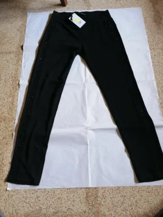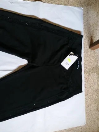Pantaloni da donna neri, comodi ed elasticizzati. Presentano una decorazione di strass lungo i lati. - Tessuto morbido e confortevole. - Dettagli scintillanti sui lati.