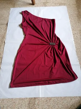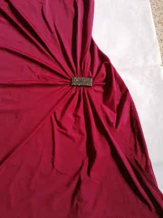 Elegante vestito da donna con dettaglio monospalla. - Tessuto morbido e drappeggiato. - Dettaglio gioiello sul fianco. Si consiglia di aggiungere una bratellina trasparente sulla spalla opposta.