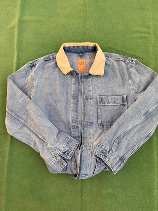 Giacca in denim firmata GAP perfetta per le mezze stagioni - Colletto in velluto a coste color crema. - Chiusura con bottoni. - Tasca applicata sul petto. - Polsini con bottone.