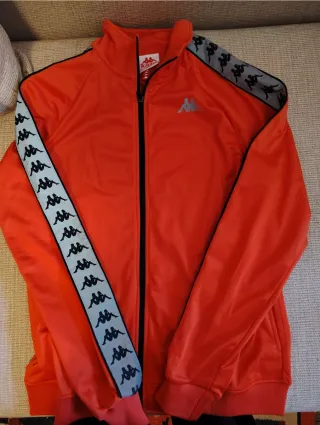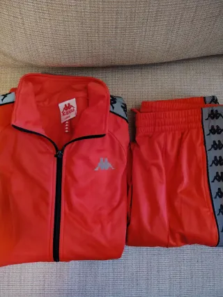 Completo tuta Kappa composto da giacca e pantaloni. - Giacca rossa con zip frontale. - Dettagli a banda grigia con logo Kappa sui lati. - Pantaloni rossi con elastico in vita.