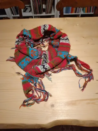 Sciarpa scialle lavorato a maglia con un design colorato e vivace. Perfetto per aggiungere un tocco di stile. - Motivo a fantasia multicolore. - Lavorazione a maglia. - Dettagli con frange.