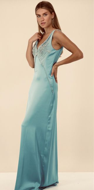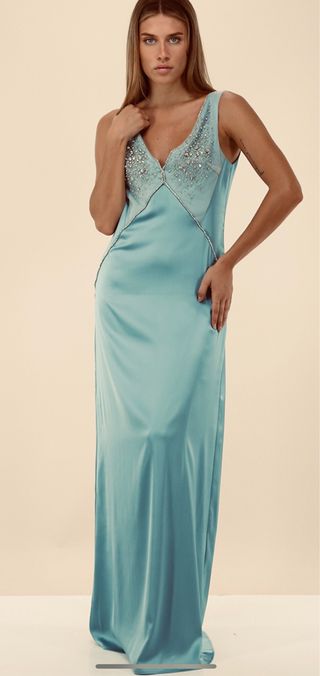 raffinato abito lungo, in raso e tulle, con interno foderato, scollo a V nella parte anteriore e posteriore. chiusura a zip, applicazioni a contrasto color argento sul tulle
