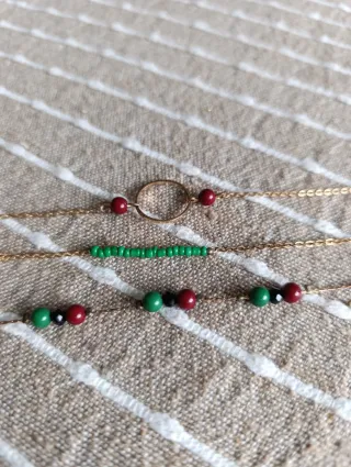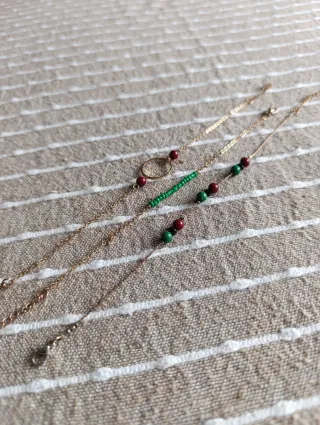 Set di tre bracciali con catenina dorata e perline verdi e bordeaux. Possono essere indossati da soli o insieme. Lunghezza regolabile. Chiusura a moschettone.