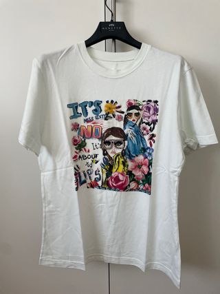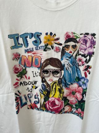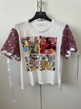 Luckylu Milano t-shirt manica corta donna stampata, taglia M, colore bianco e fantasia con applicazioni in raso sulle maniche, girocollo, con disegno ed alcune pajettes colorate sul davanti , vestibilita regolare. Usata poche volte in ottime condizioni. Composizione 50% cotone e 50% modal.