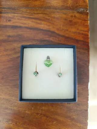 Elegante parure composta da ciondolo a forma di cuore e orecchini abbinati in smeraldo sintetico. Nuovi mai indossati. Vendo con scatolina regalo